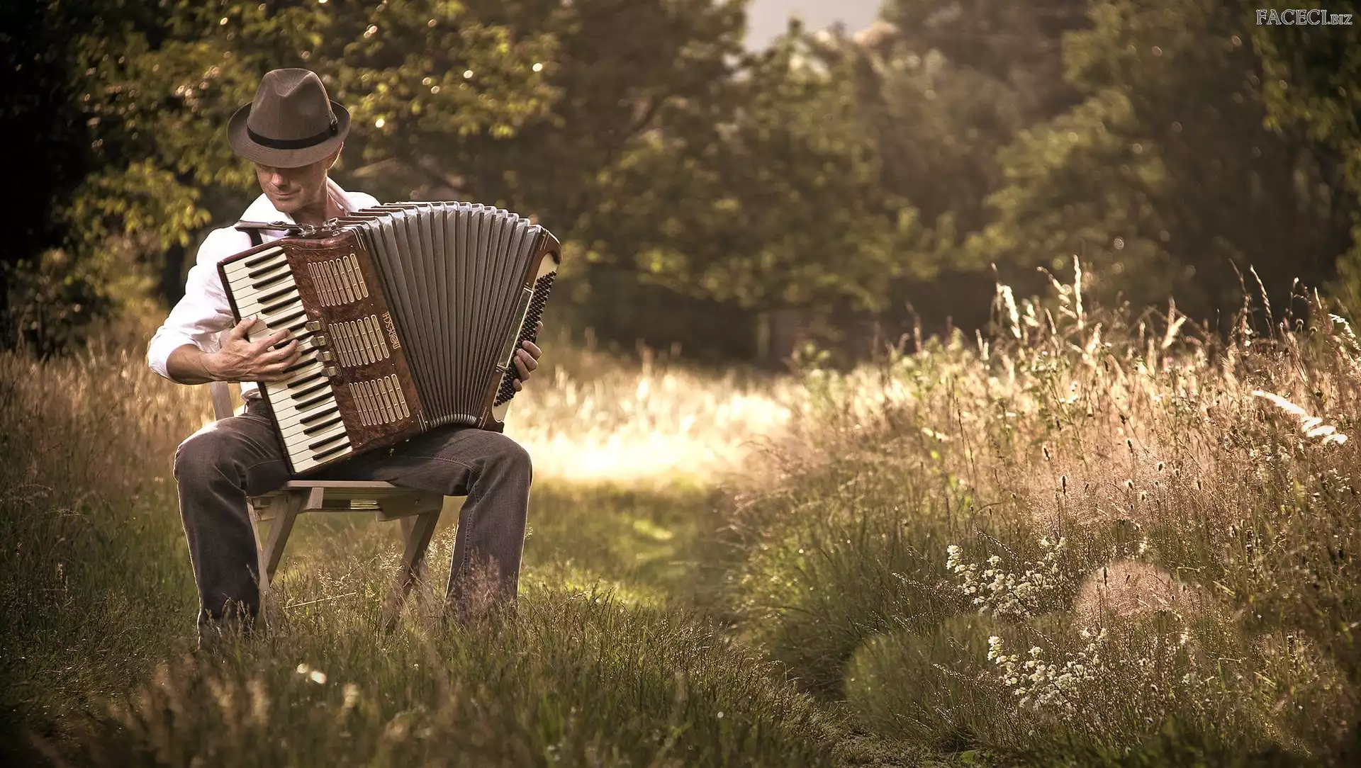 Kapelusz, Łąka, Mężczyzna, Akordeon - faceci.biz